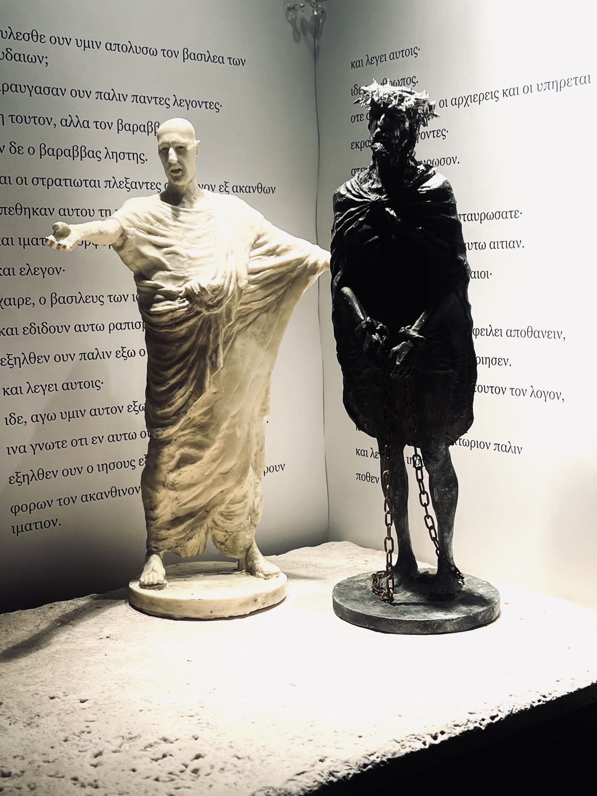 左のピラト像は白いプラスチック素材で、衣服のドレープや伸ばした手の仕草により「問いかける」姿勢が強調されています。一方で右のイエス像は黒みを帯びた金属(減摩合金)で表現され、頭には茨の冠、身体は痩せ細り、鎖に繋がれています。光と影、白と黒、権力者と囚われ人という二項対立がコントラストを形成しています。また、背景にギリシャ語原典の聖句が配され、作品そのものが「言葉と造形」の両面で聖書の出来事を再現していることが伝わります。